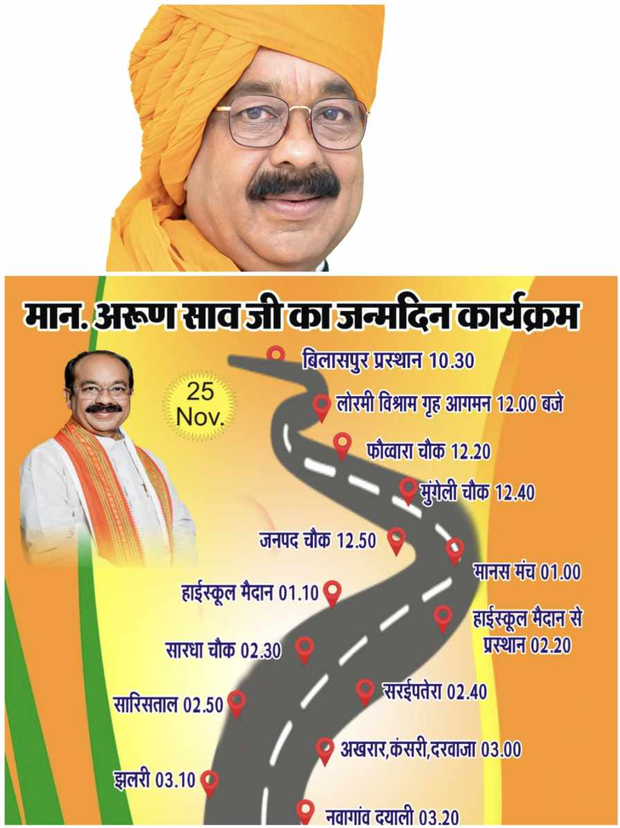 डिप्टी सीएम अरुण साव कार्यकर्ताओ को सम्बोधित करेंगे ततपश्चात कार्यक्रम स्थल से प्रस्थान करेंगे जहाँ सारधा चौक, सरईपतेरा, सारिसताल, अखरार, कन्सरी, दरवाजा, झलरी, नवागांव दयाली, डोंगरिगढ़ चौक, डिंडौरी, साल्हेघोरी, खाम्ही में कार्यकर्ताओं व ग्रामीणों के द्वारा स्वागत किया जायेगा। शाम 6 बजे मुंगेली के लिए प्रस्थान करेंगे।