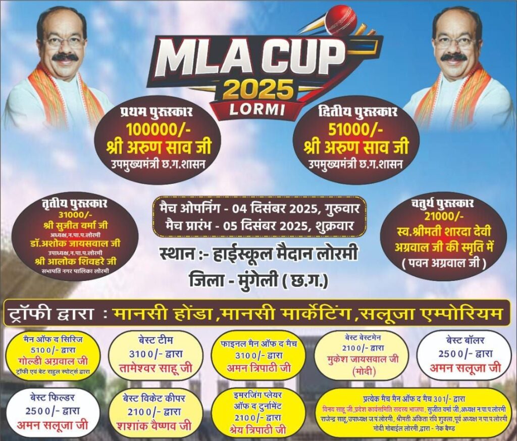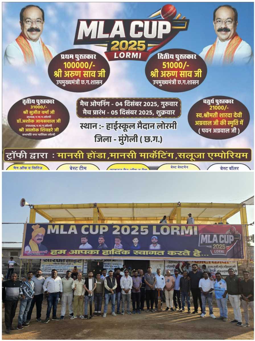 नगर के हाई स्कूल मैदान में आईपीएल की तर्ज में एम एल ए कप 2025 का आयोजन किया जा रहा, जिसमे 16 टीमो ने हिस्सा लिया है सभी टीमो का लोरमी नगरपालिका अध्यक्ष सुजीत वर्मा, वरिष्ट भाजपा नेता राकेश दुबे, विनय साहू, पार्षद रिक्की सलुजा, घनश्याम यादव, शशांक वैष्णव, धनन्जय दुबे, मनोज निषाद, पत्रकार जितेन्द्र पाठक के द्वारा सभी टीमो का जर्सी लांच कर एम एल ए कप 2025 का शुभारंभ किया गया। तत्पश्चात पत्रकार इलेवन व नगर पालिका इलेवन के बीच सद्भावना मैच 6-6 ओवर का खेला गया पत्रकार इलेवन के कप्तान जितेन्द्र पाठक ने टॉस जीतकर पहले बैटिंग का फैसला लिया पहले बल्लेबाजी करते हुए ओपनिग जोड़ी आकाश सलुजा व समीर पाठक ने शानदार बल्लेबाजी टीम को अच्छी शुरुवात दिए, दूसरे क्रम में बल्लेबाजी करने आये कप्तान जितेन्द्र पाठक ने नाबाद 10 रन बनाए टीम के बल्लेबाज राहुल यादव, निशांत कश्यप, का सराहनीय योगदान रहा पत्रकार इलेवन ने 6 ओवर में 5 विकेट पर 38 रन बनाए। पार्षद रिक्की सलुजा ने गेंदबाजी में शानदार प्रदर्शन करते हुए 3 विकेट लिए।
