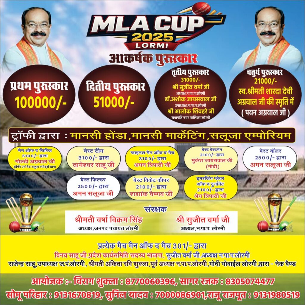 लोरमी नगर के हाई स्कूल मैदान में आईपीएल के तर्ज में एमएलए कप क्रिकेट प्रतियोगिता 2025 का 5 दिसम्बर से हाईस्कूल के मैदान में खेला जा रहा था इस प्रतियोगिता में 16 फ्रेन्जाइची ने अपनी टीम को उतारा था, प्रतिदिन 4 मैच का आयोजन किया जा रहा 20 दिसम्बर शनिवार को पहला सेमीफाइनल मुकाबला यक्ष यंगस्टार और श्रेयांश सुपर स्ट्राइकर के बीच 10-10 ओवर का मैच खेला गया, यक्ष यंगस्टार ने टॉस जीतकर पहले बॉलिंग का फैसला लिया, श्रेयांश सुपर स्ट्राइकर निर्धारित 10 ओवर में 7 विकेट पर 108 रन का लक्ष्य रखा, दिनेश ने 18 बाल में 35 रन बनाए। यक्ष यंगस्टार के बॉलर सुमन ने 2 ओवर में 15 पर 2 विकेट लिए। रनों के पीछा करने उतरी यक्ष यंगस्टार के 9.5 ओवर में 6 विकेट पर 109 रन बनाकर शानदार जीत हासिल किए। सुमन ने शानदार बल्लेबाजी करते हुए 15 गेंदों पर 35 रन बनाए और मैन आफ द मैच रहे और अपने टीम को फ़ायनल में पहुचाये।