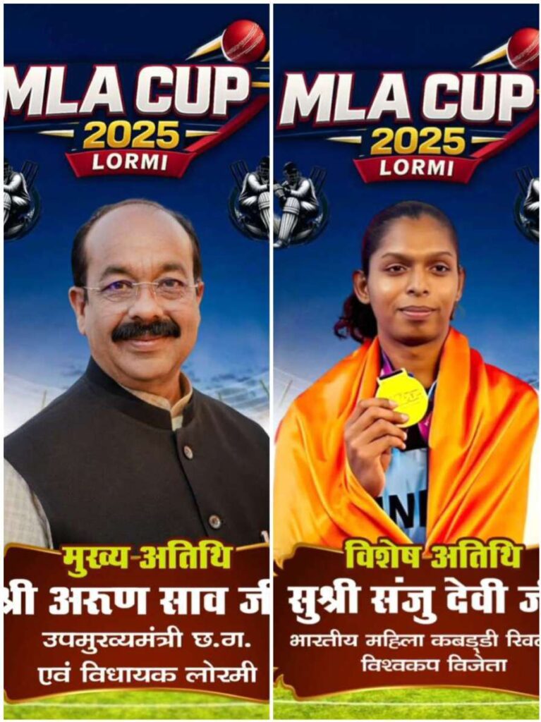 लोरमी – लोरमी नगर के हाईस्कूल मैदान में आईपीएल की तर्ज पर एमएलए कप क्रिकेट प्रतियोगिता 2025 का शानदार आयोजन किया जा रहा है जिसका फायनल मुकाबला 21 दिसम्बर रविवार को 12 बजे खेला जाएगा। क्रिकेट प्रतियोगिता में 16 फ्रेंचाइजी के द्वारा टीमो को उतारा गया। मुख्य अतिथि के रूप में उपमुख्यमंत्री व विधायक अरुण साव, विशिष्ट अतिथि सुश्री संजू देवी भारतीय महिला कबड्डी खिलाड़ी विश्व विजेता उपस्थित रहेंगे।