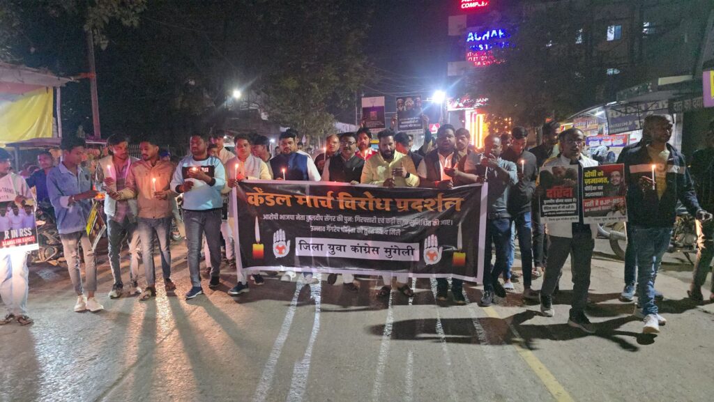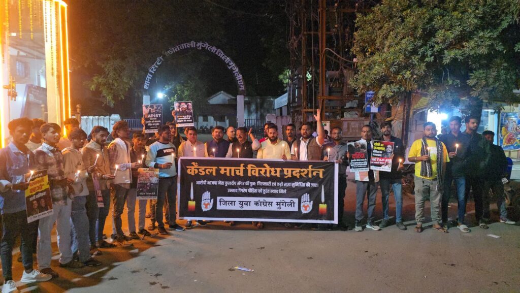 मुंगेली – प्रदेश प्रभारी अमित सिंह पठानिया, सह प्रभारी मोनिका मंडारे, प्रदेश अध्यक्ष आकाश शर्मा और जिला प्रभारी नजरुल इस्लाम के निर्देशन पर भाजपा के पूर्व विधायक कुलदीप सिंह सेंगर की जमानत के खिलाफ मुंगेली नगर में केंडल मार्च निकाल कर प्रदर्शन किया। युवा कांग्रेस ने जमानत रद्द करने और पीड़िता को सुरक्षा देने की मांग की, साथ ही सरकार की नीयत पर सवाल उठाया।