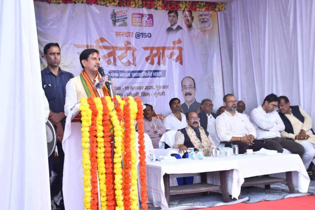 भारत के लौह पुरुष सरदार वल्लभभाई पटेल की 150वीं जयंती के अवसर पर मुंगेली में भी यूनिटी मार्च का आयोजन किया गया। कार्यक्रम में केन्द्रीय राज्यमंत्री श्री साहू और स्थानीय विधायक पुन्नूलाल मोहले ने सरदार पटेल की प्रतिमा पर पुष्पांजलि अर्पित की और एकता रैली का शुभारंभ किया। यह यात्रा रेस्ट हाउस मैदान से प्रारंभ होकर दाउपारा, बालानी चौक होते हुए कृषि उपज मंडी परिसर में समाप्त हुई। रैली के माध्यम से देश की एकता, अखंडता और राष्ट्रीय एकजुटता का सशक्त संदेश दिया गया और आत्मनिर्भर भारत का संकल्प लिया गया। कार्यक्रम के समापन में एकता के प्रतीक सरदार पटेल के आदर्शों को आत्मसात करते हुए राष्ट्रीय एकजुटता का संदेश देने वाले माय भारत टीम को प्रशस्ति पत्र भेंटकर सम्मानित किया गया। इसी प्रकार स्वच्छता दीदी, वरिष्ठ नागरिक एवं उत्कृष्ट प्रदर्शन करने वाले छात्र-छात्राओं को भी प्रशस्ति पत्र प्रदान कर सम्मानित किया गया। इस दौरान जिला पंचायत श्रीकांत पाण्डेय, जनपद पंचायत अध्यक्ष रामकमल सिंह, जिला पंचायत सदस्य रजनी मानिक सोनवानी, स्थानीय जनप्रतिनिधिगण मौजूद रहे। कार्यक्रम में मुख्य नगरपालिका अधिकारी होरी सिंह ठाकुर ने आभार व्यक्त किया।