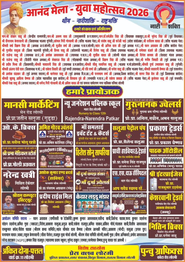 लोरमी – प्रतिवर्ष की तरह इस वर्ष भी मुक्ति वेलफेयर सोसायटी लोरमी के द्वारा विवेकानंद जयंती सप्ताह के अवसर पर हाईस्कूल मैदान लोरमी में आनंद मेला युवा महोत्सव का आयोजन किया जा रहा है।