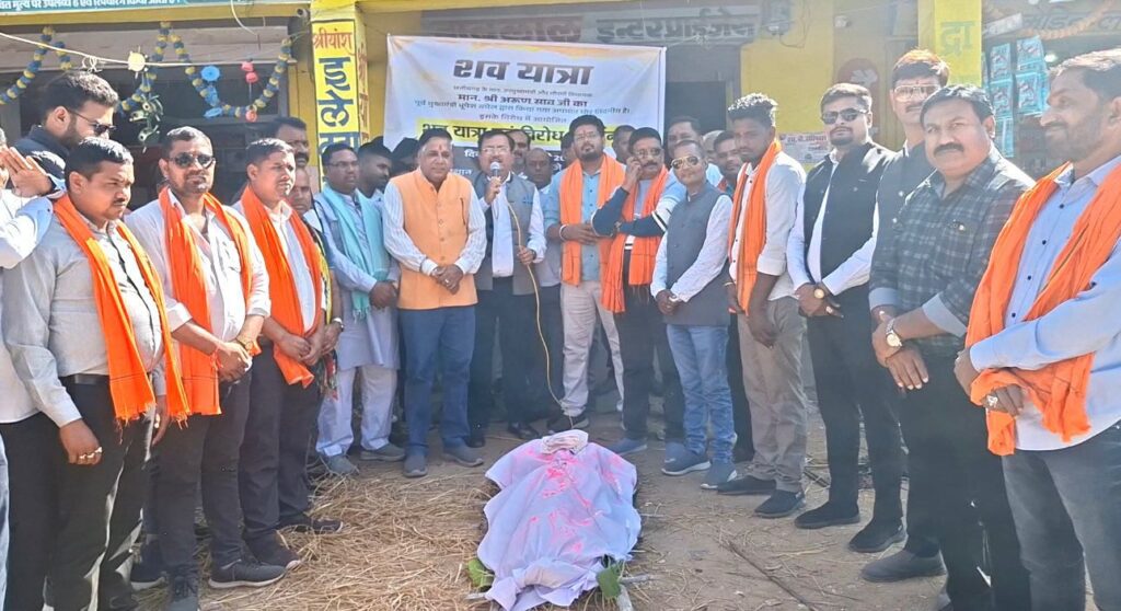 लोरमी – उप मुख्यमंत्री लोरमी विधायक अरूण साव को पूर्व मुख्यमंत्री भूपेश बघेल के द्वारा अपने भाषण में बंदर बोलकर अपमान किए जाने के विरोध में आज भारतीय जनता युवा मोर्चा के नेतृत्व में भूपेश बघेल का शव यात्रा निकाल कर विरोध प्रदर्शन किया गया प्रदर्शन के दौरान भाजपा के वक्ताओं ने पूर्व की कांग्रेस सरकार की आलोचना करते हुए कहा कि कांग्रेस की सरकार ने छत्तीसगढ़ को बर्बाद कर दिया है।