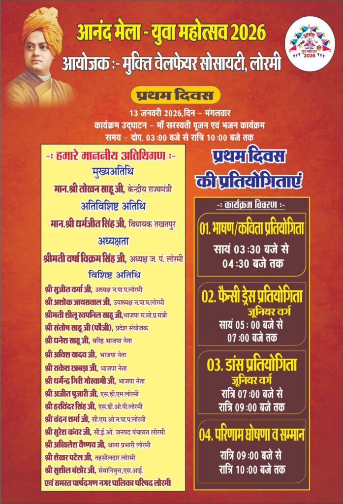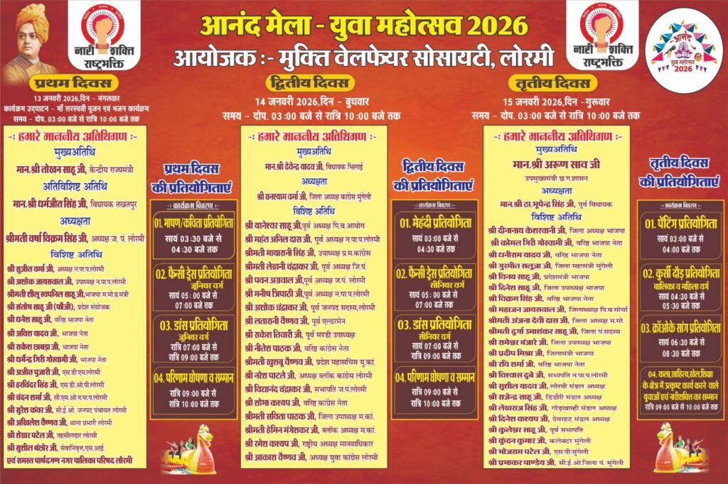 लोरमी – प्रतिवर्षानुसार इस साल भी मुक्ति वेलफेयर सोसायटी लोरमी के द्वारा विवेकानंद जयंती सप्ताह के अवसर पर हाईस्कूल मैदान लोरमी में तीनदिवसीय आनंद मेला युवा महोत्सव का आयोजन किया गया है। जिसका शुभारंभ केंद्रीय राज्यमंत्री तोखन साहू करेंगे।
