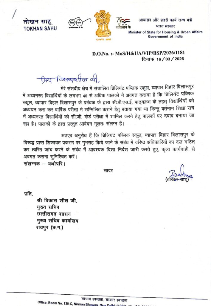 बिलासपुर – अपने संसदीय क्षेत्र में शिक्षा से जुड़े एक गंभीर प्रकरण पर केन्द्रीय आवासन एवं शहरी कार्य राज्य मंत्री तोखन साहू ने कड़ा रुख अपनाया है। ब्रिलियंट पब्लिक स्कूल, व्यापार विहार में विद्यार्थियों और पालकों किए गए गुमराह करने के मामले को उन्होंने बेहद गंभीरता से लेते हुए छत्तीसगढ़ शासन के मुख्य सचिव विकास शील से सीधे चर्चा की और तत्काल कार्रवाई के लिए औपचारिक पत्र भी प्रेषित किया।